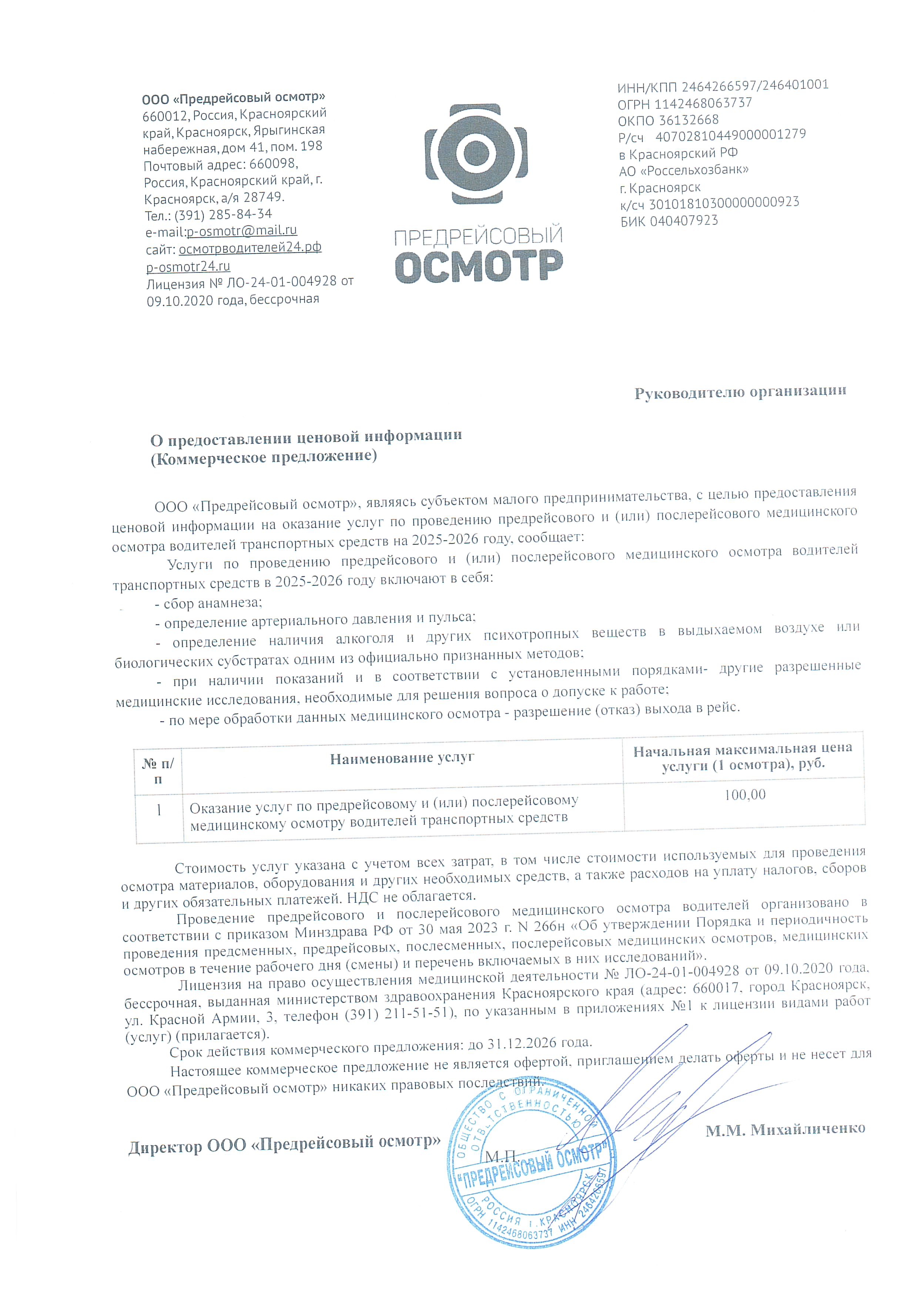 Стоимость услуг предрейсовых/послерейсовых осомтров водителей — одна из самых низких на рынке Красноярска,